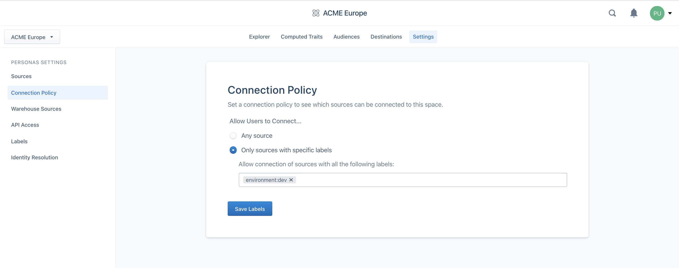 If you haven’t already, Segment highly recommends labeling all your sources with Dev or Prod environments. Once your sources have been labeled, visit the Connection Policy page by navigating to Unify > Unify settings > Space management. Here, you can enforce that only sources labeled Dev can be connected to your Dev Unify instance.
